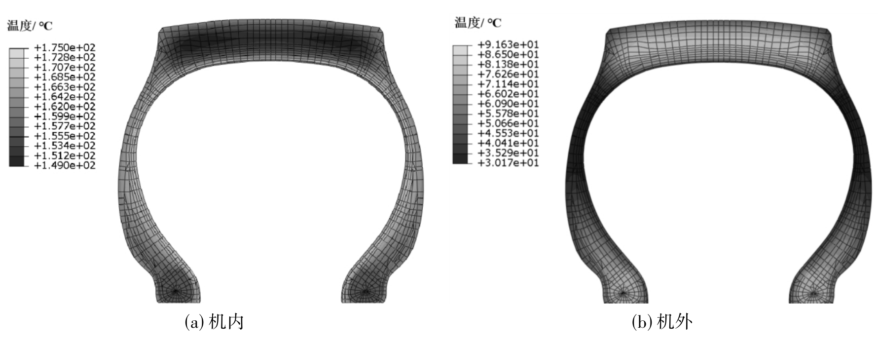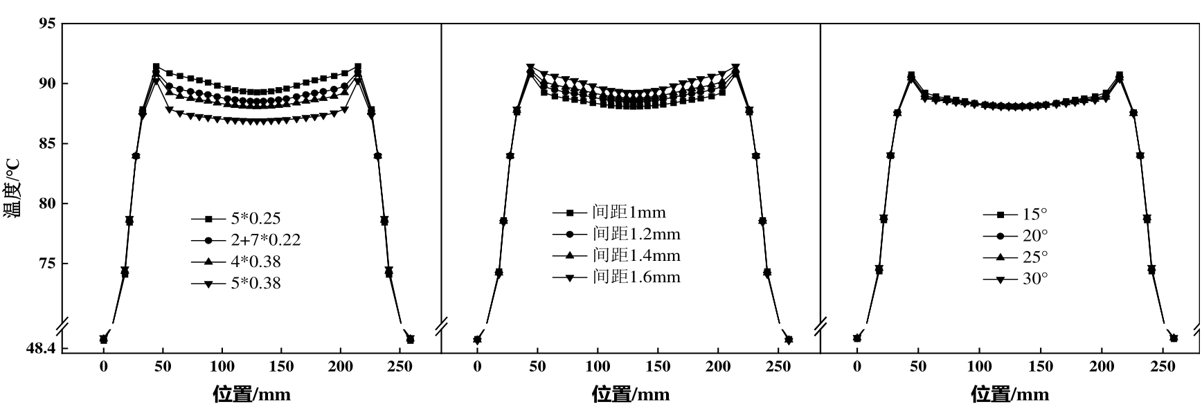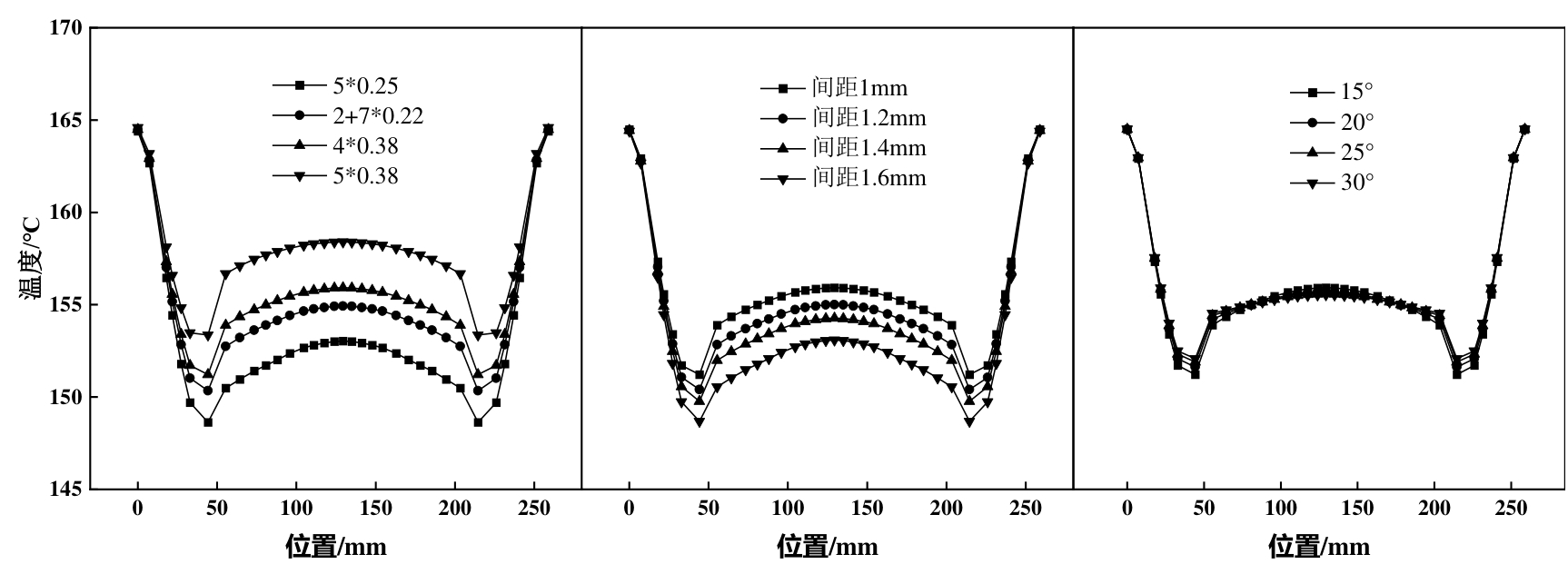 图11 不同结构带束层机内硫化结束温度分布曲线注:(a)不同型号 (b)不同排列间距 (c)不同排列角度