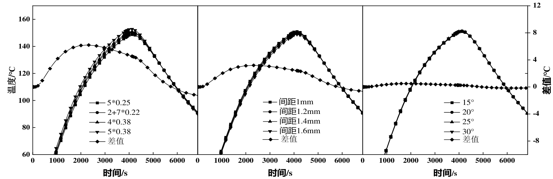 图13 不同结构带束层对胎肩部位升降温曲线影响注:(a)不同型号 (b)不同排列间距 (c)不同排列角度