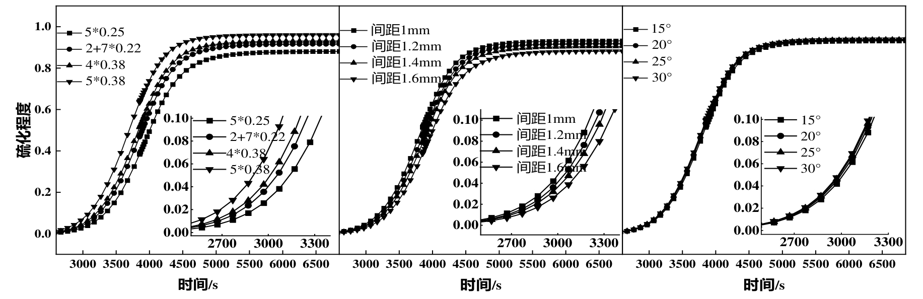 图14 不同结构带束层对胎肩部位硫化程度的影响注:(a)不同型号 (b)不同排列间距 (c)不同排列角度