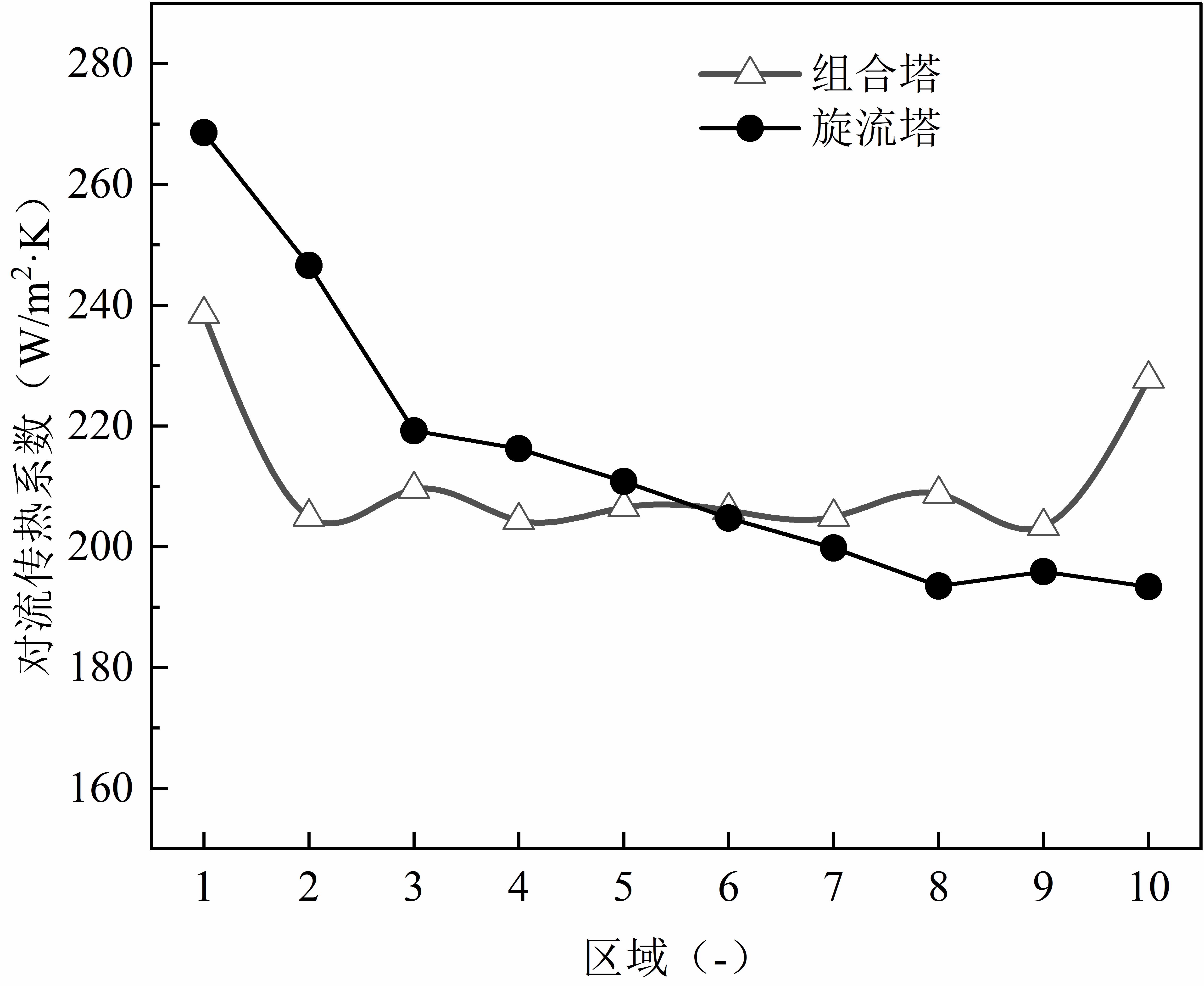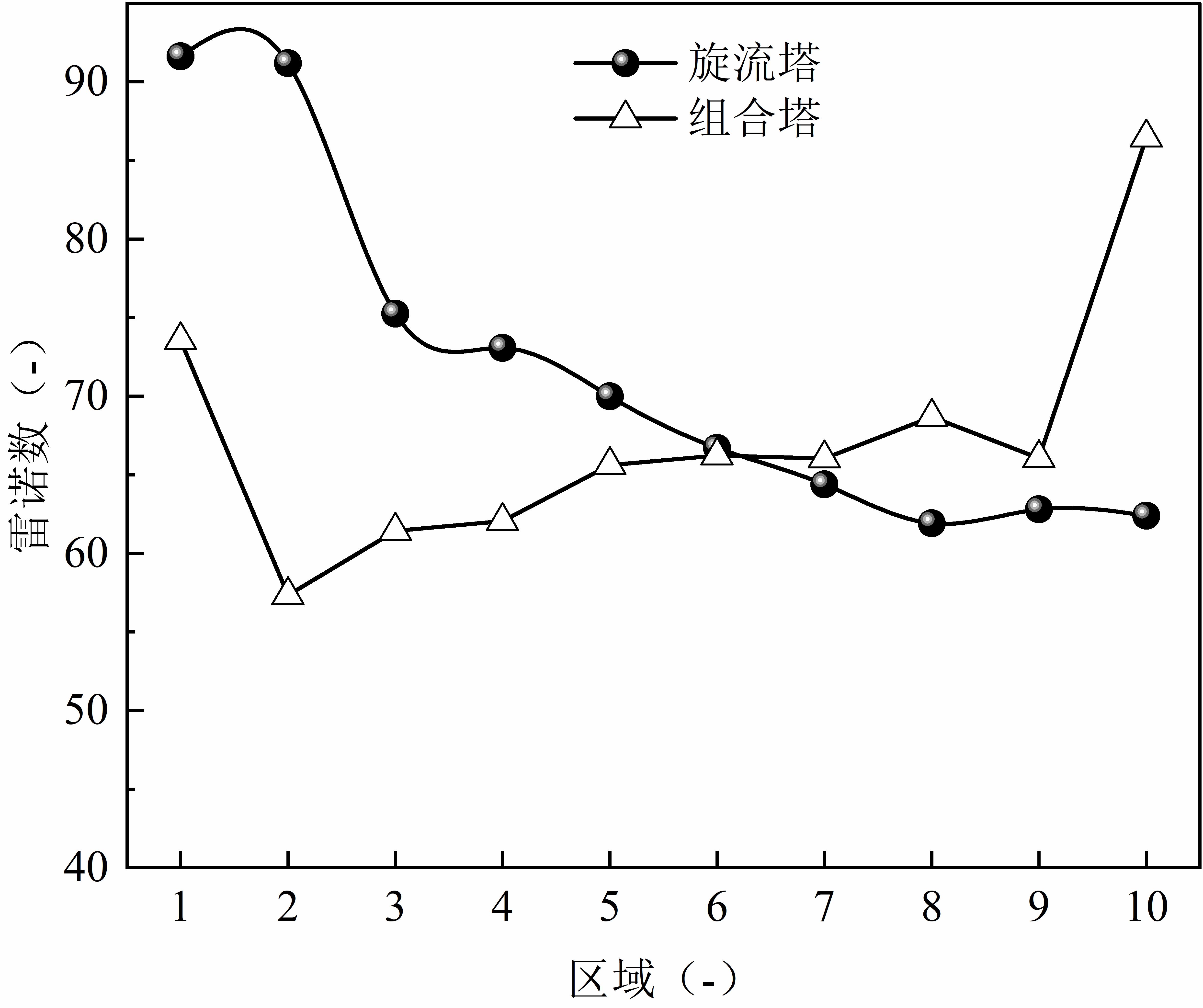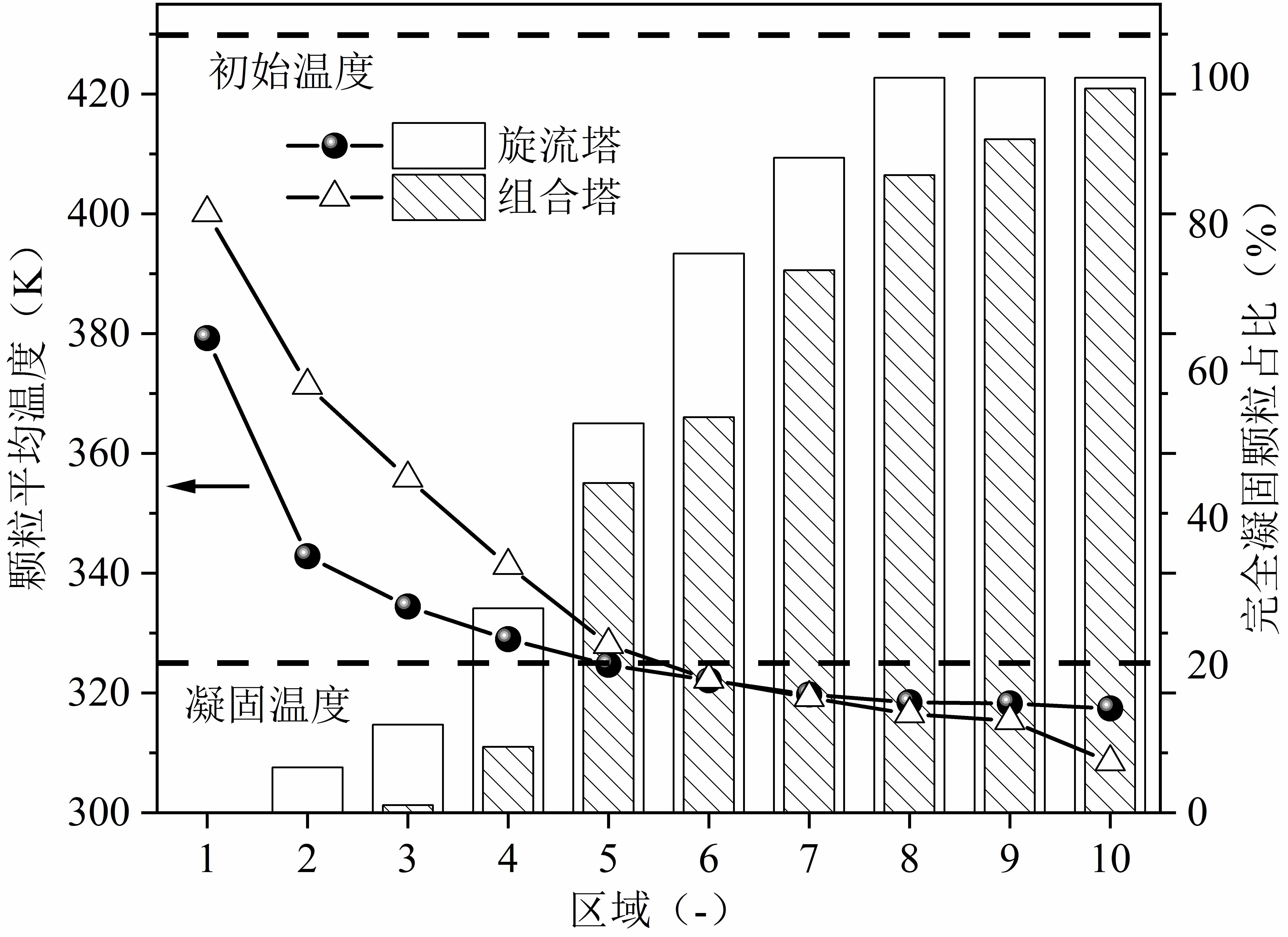 改善两相的流动和传热特性是提升造粒塔性能的关键。本文采用计算颗粒流体力学方法研究了硬脂酸在旋流式并流冷却造粒塔和常规逆流组合塔中的传热和造粒特性。结果表明:旋流塔中全部液滴降温至凝固点所需要的高度大约是常规塔的一半。颗粒在旋流塔内平均停留时间为5.3 s,常规塔的对应值为8.5 s,这意味着前者的生产效率更高。相较于常规塔,旋流式造粒塔在大部分区域内显示出更优的颗粒温度分布均匀性,这表明旋转并流工艺有助于实现更均匀的液滴凝固过程。旋流塔具有以上优势的原因在于入塔气体因旋转形成更高的流速,进而使气固湍动程度增强和对流传热系数提高。此外,气流旋转形成的离心力场促使液滴向塔壁迁移,存在黏壁风险,但迁移过程也是对流传热最强的阶段,合理调控流场可消除风险。