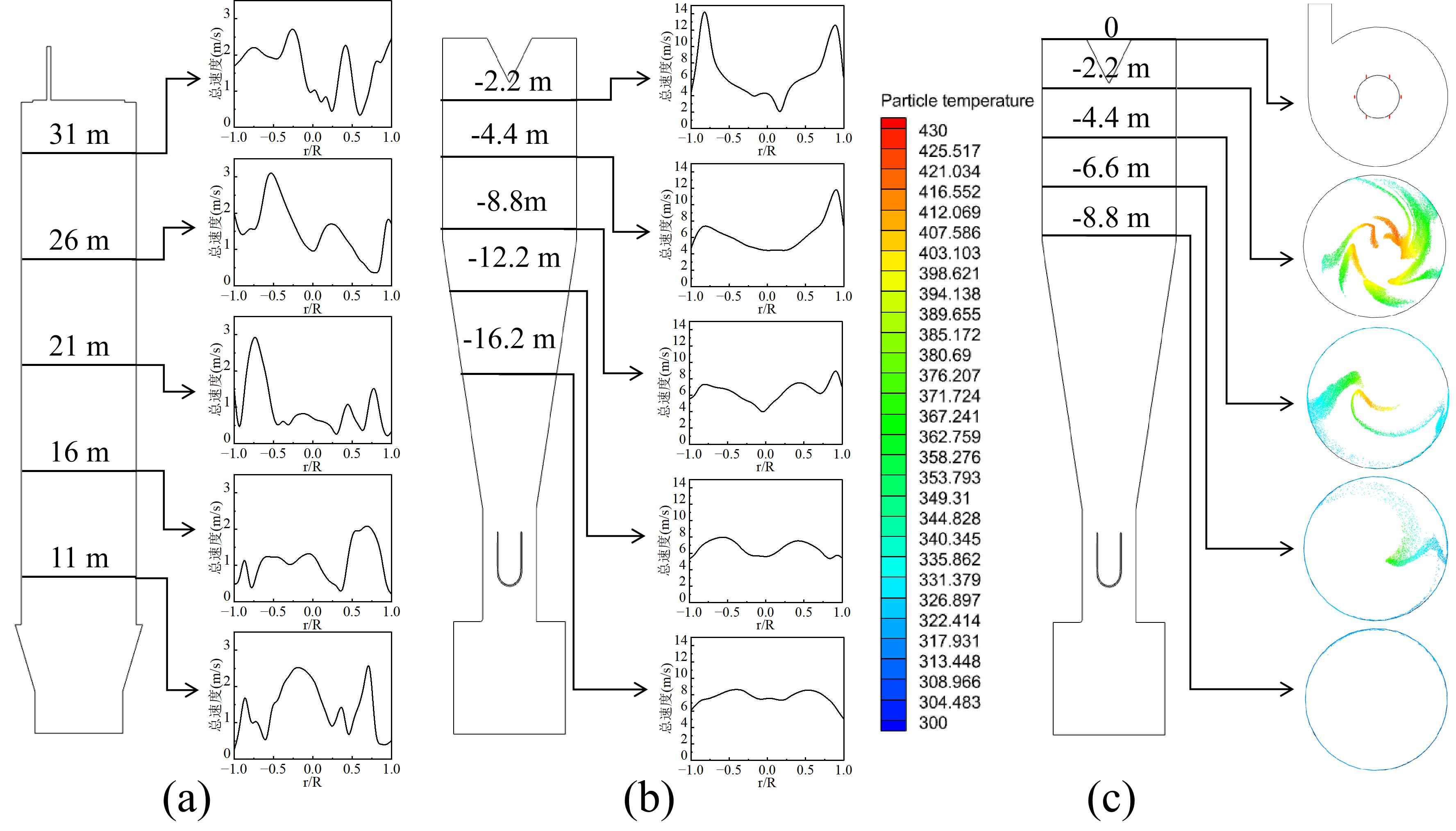 Fig.1 Geometric model, boundary conditions, and variation of tangential velocity with radial position in the granulation tower: (a)combined tower, (b)swirling tower, (c)variation of tangential velocity with radial position