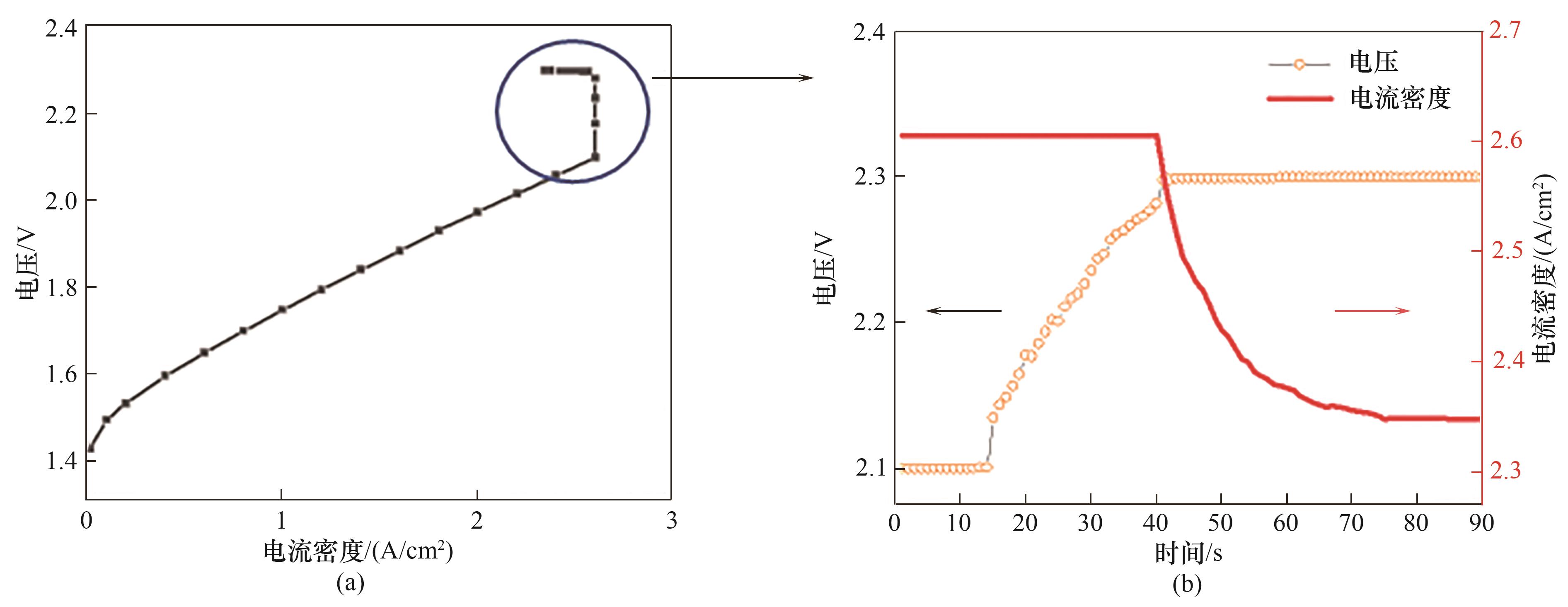 Fig.7 (a) Polarization curve for suddenly increased mass transfer polarization at 3 ml/min; (b) Plot of current and voltage versus time in 90 s after significant mass transfer polarization occurs