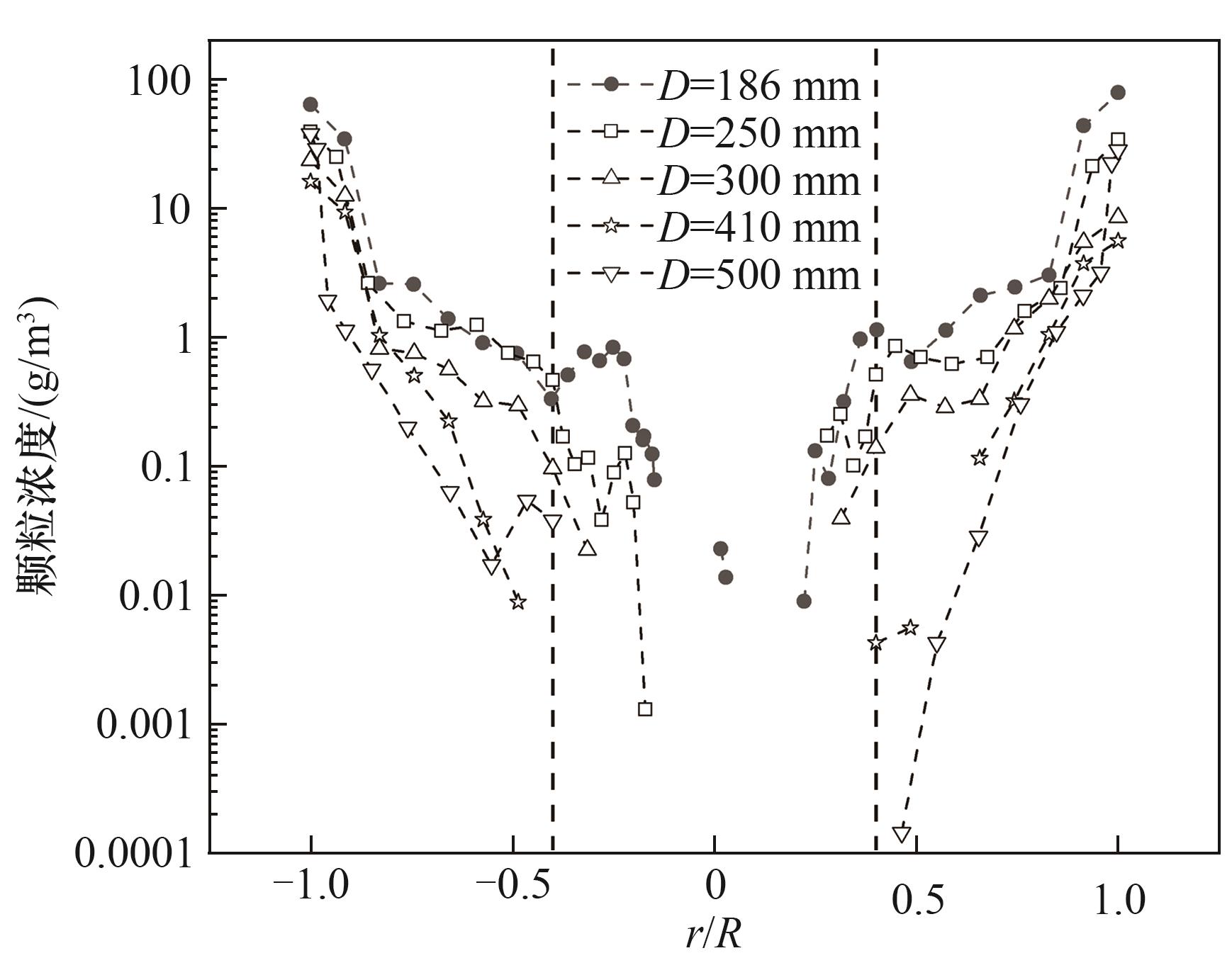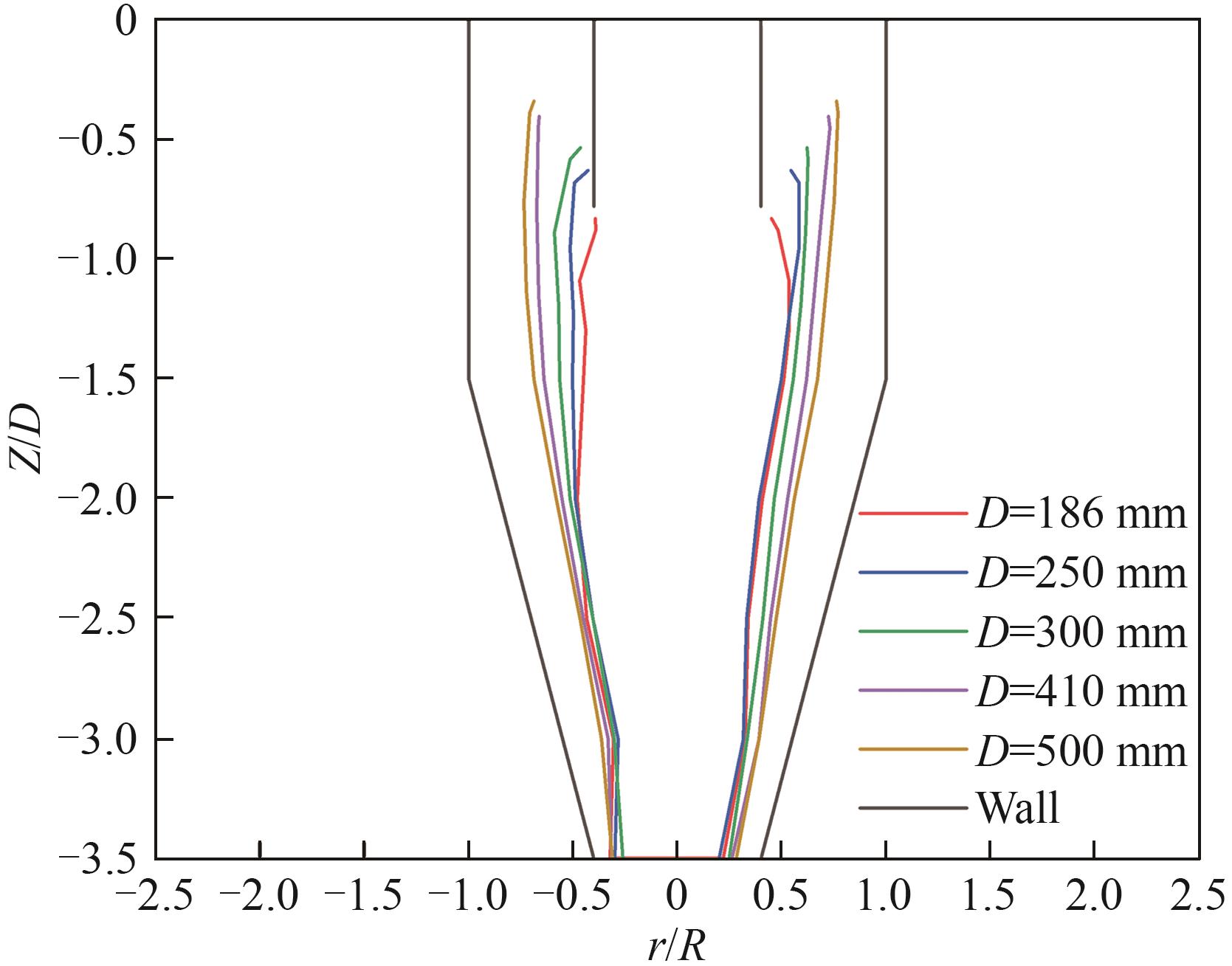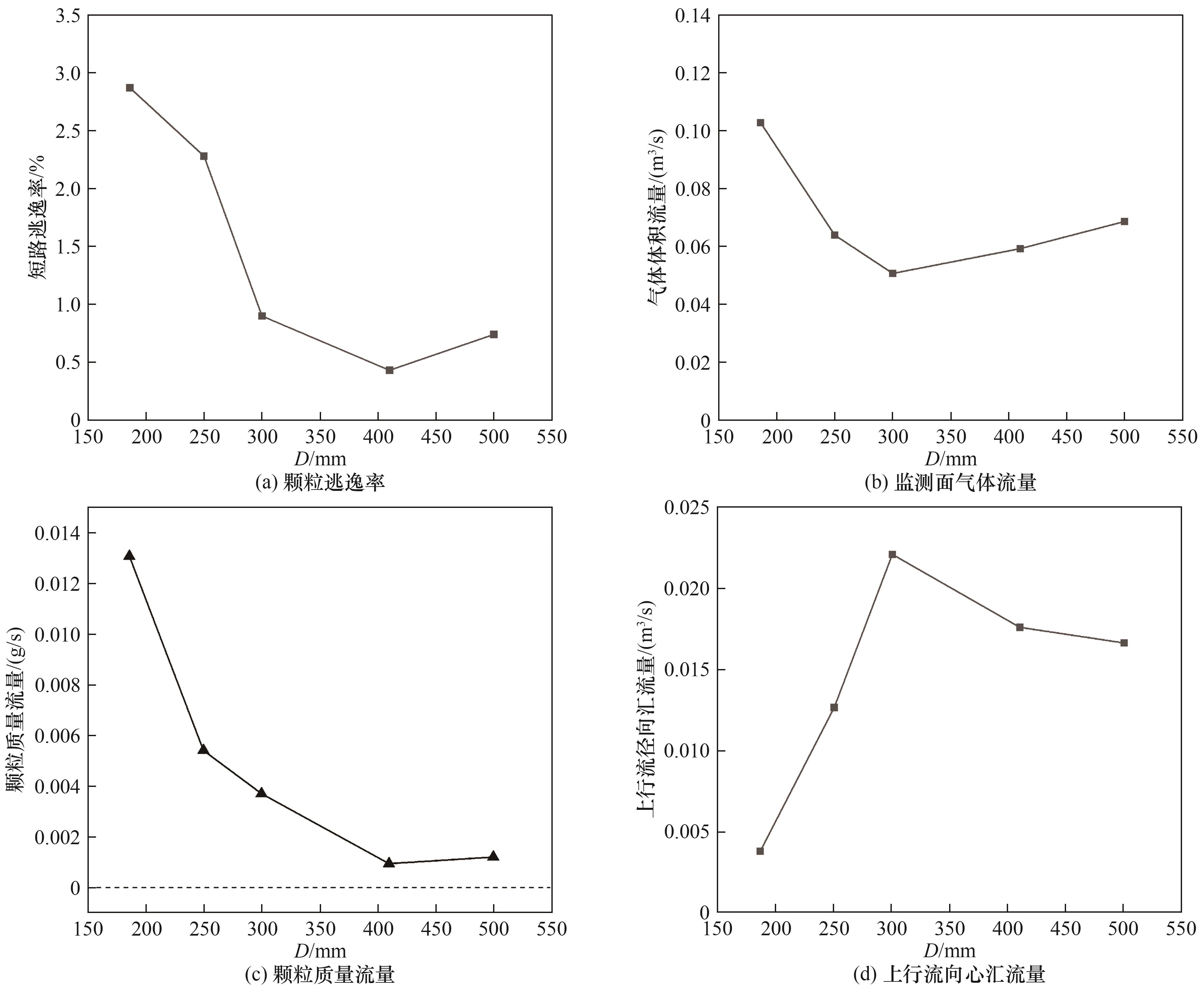 筒体直径是旋风分离器尺寸优化的核心,但关于其对性能的影响,文献报道了不同结果,且鲜有探讨其流场机制。在控制入口尺寸为145 mm×63 mm,入口气速为27.5 m/s,其他尺寸与筒径成一定比例的条件下,通过性能测试研究筒径对旋风分离器性能的影响;利用计算流体力学(computational fluid dynamics, CFD)探索流场机制。结果表明,压降随筒径增加而减小,切向速度的降低是主因。分离效率随筒径增加而先增后减,最佳效率筒径约410 mm。流场分析表明其与以下机制有关:分离器内气流切向速度和轴向速度随着筒径的增加而降低,但轴向速度降幅更大,且在大筒径中产生滞留现象,二者共同作用使内旋流对微小颗粒的二次分离能力随筒径增加而提高,返混逃逸率因此降低。筒径增大后,上行流区域扩张,排气管口较强的径向汇流对上行流产生影响,造成颗粒短路逃逸的同时也加剧了内旋流所持颗粒的逃逸,逃逸量随筒径增加而先减小后增大,最佳筒径处最低。增大筒径会使得排气管外形成上行流屏障,颗粒短路逃逸难度增大,但过分增加筒径会造成短路流量增加。