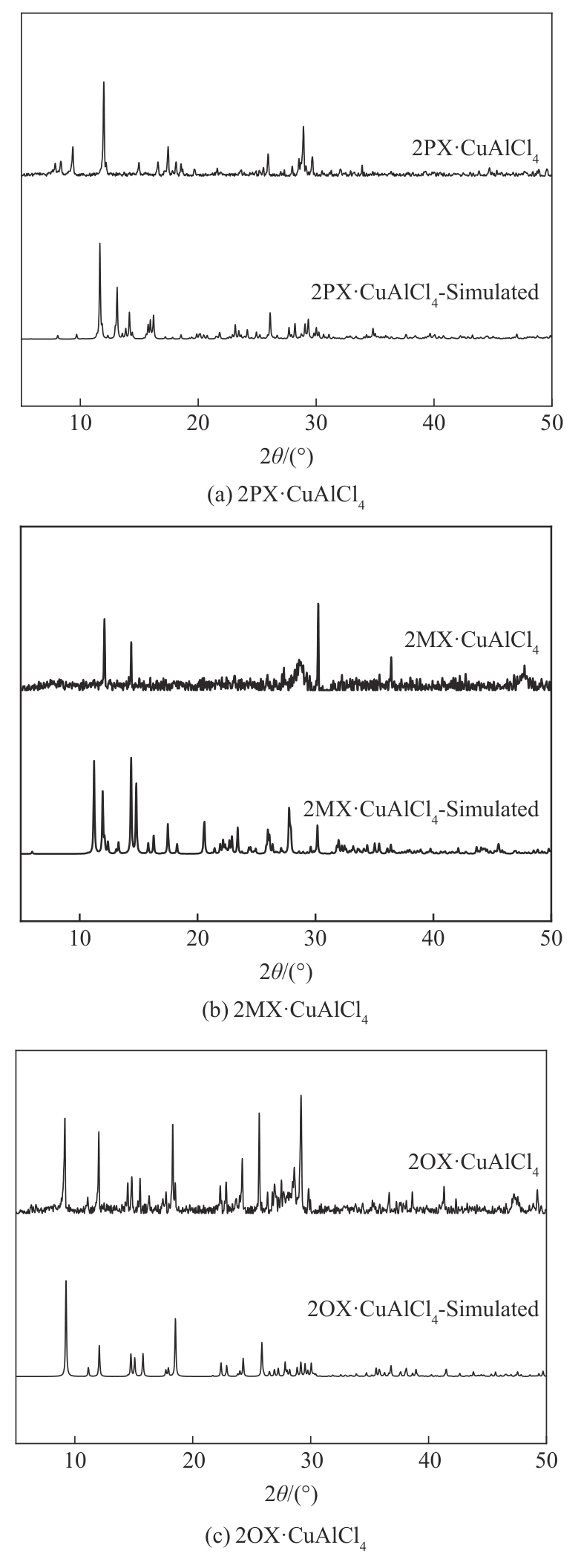Para-xylene (PX) is an important basic chemical raw material. The separation of PX from mixed xylenes (mixture of meta-xylene (MX), ortho-xylene (OX), and PX) is a prerequisite for its utilization. The complex crystallization method, combining complexation with crystallization, has great potential for separating PX from mixed xylenes. Three new crystals including 2PX·CuAlCl4, 2MX·CuAlCl4, and 2OX·CuAlCl4 were obtained by complexing the bimetallic halide CuAlCl4 with xylene isomers by π-complexation as a complexing agent. The melting points of these crystals were 41.0℃, 15.1℃ and 55.7℃, respectively. The solid-liquid equilibrium data of the binary systems 2PX·CuAlCl4/2MX·CuAlCl4 and 2PX·CuAlCl4/2OX·CuAlCl4 were further determined. Both were simple eutectic systems. The mole fraction of 2PX·CuAlCl4 at the eutectic point was 0.3969 and 0.6107, and the corresponding temperatures were -3.36℃ and 14.83℃, which were 49.2℃ and 47.7℃ higher than those of the pure arene binary system, respectively. The temperature required for the crystallization operation was greatly increased. The phase equilibrium data were fitted by the ideal solution model, and the results showed that the model could be used to relate the solid-liquid phase equilibrium of the binary system. This provided a thermodynamic basis for the separation of mixed xylenes by bimetallic halide complex crystallization. A purity of 98% PX was obtained through initial crystallization, verifying the feasibility of the method.
