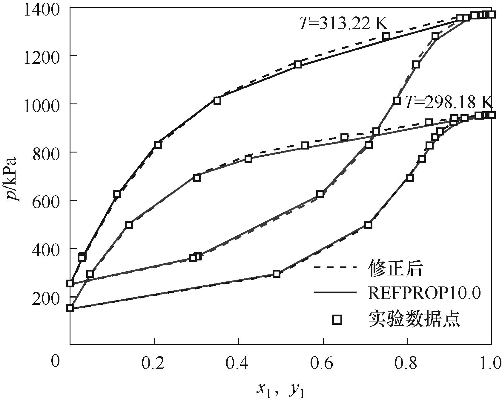 | 温度/K | Np | 修正后计算压力pcal | 修正后气相组分y | REFPROP 10.0计算压力pcal | REFPROP 10.0气相组分y |