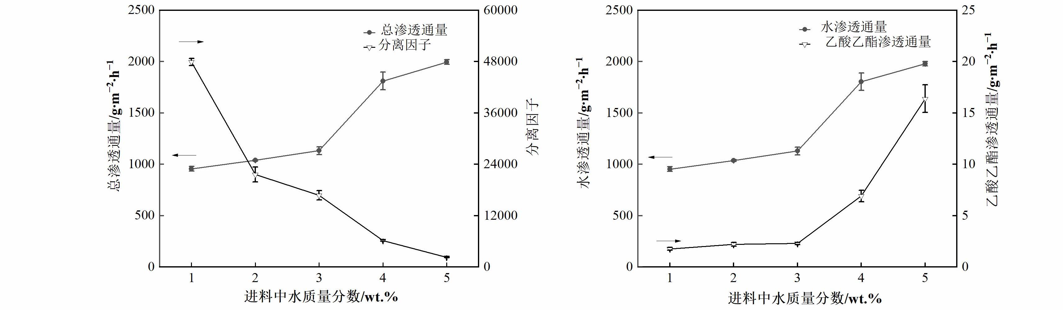 | 水-乙酸乙酯 | PVA/ZSM-5 | 30 | 4 | 1231 | 6072 | [ |