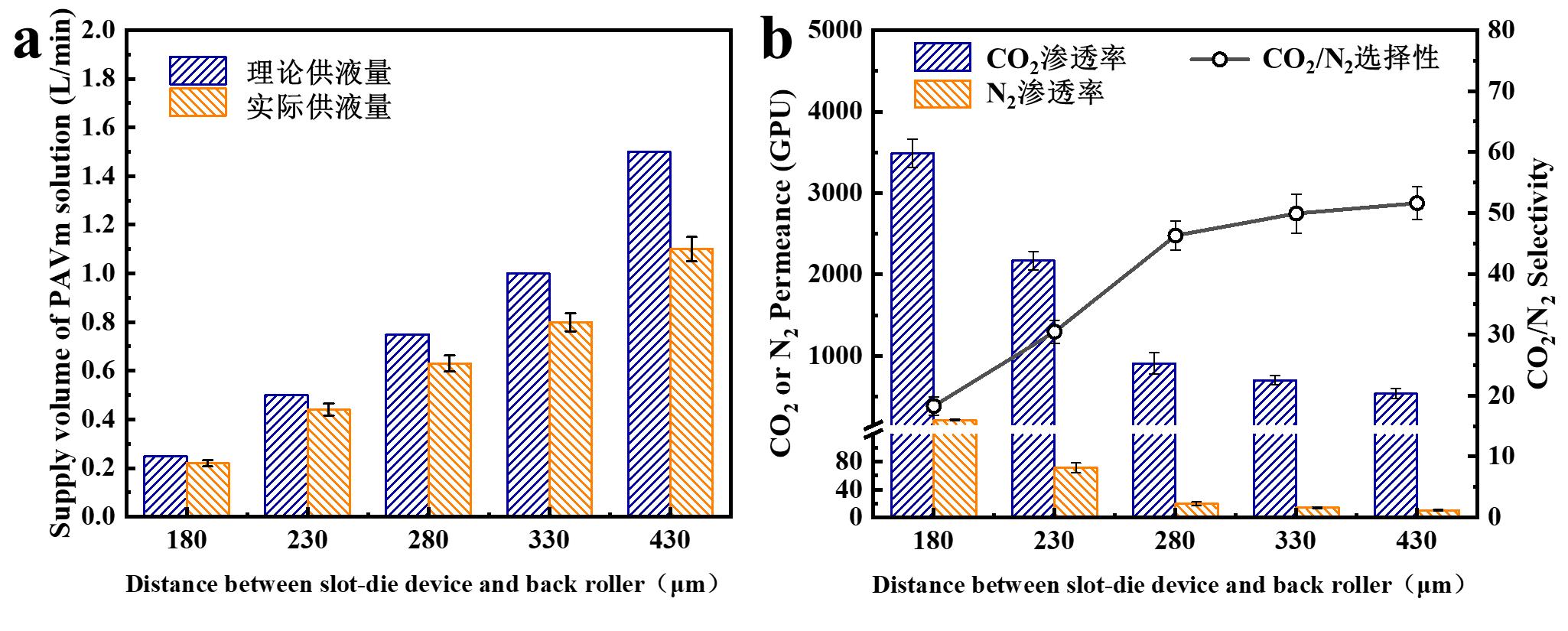 Fig.7 (a) The effects of slit gap distance on the supply volume of the slot-die coating device and (b) the CO2/N2 separation performance of PVAm TFC membranes (feed gas: CO2:N2=15:85, humidified, 0.5 MPa, 25°C)