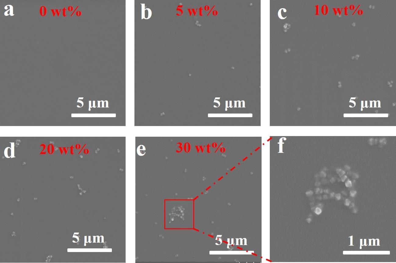 Fig.9 The surface SEM images of MMMs prepared with different UiO-66-NH2@PVAm loading: (a) 0 wt%, (b) 5 wt%, (c) 10 wt%, (d) 20 wt% and (e) 30 wt%; (f) the high-resolution SEM image of MMMs with 30 wt% UiO-66-NH2@PVAm loading