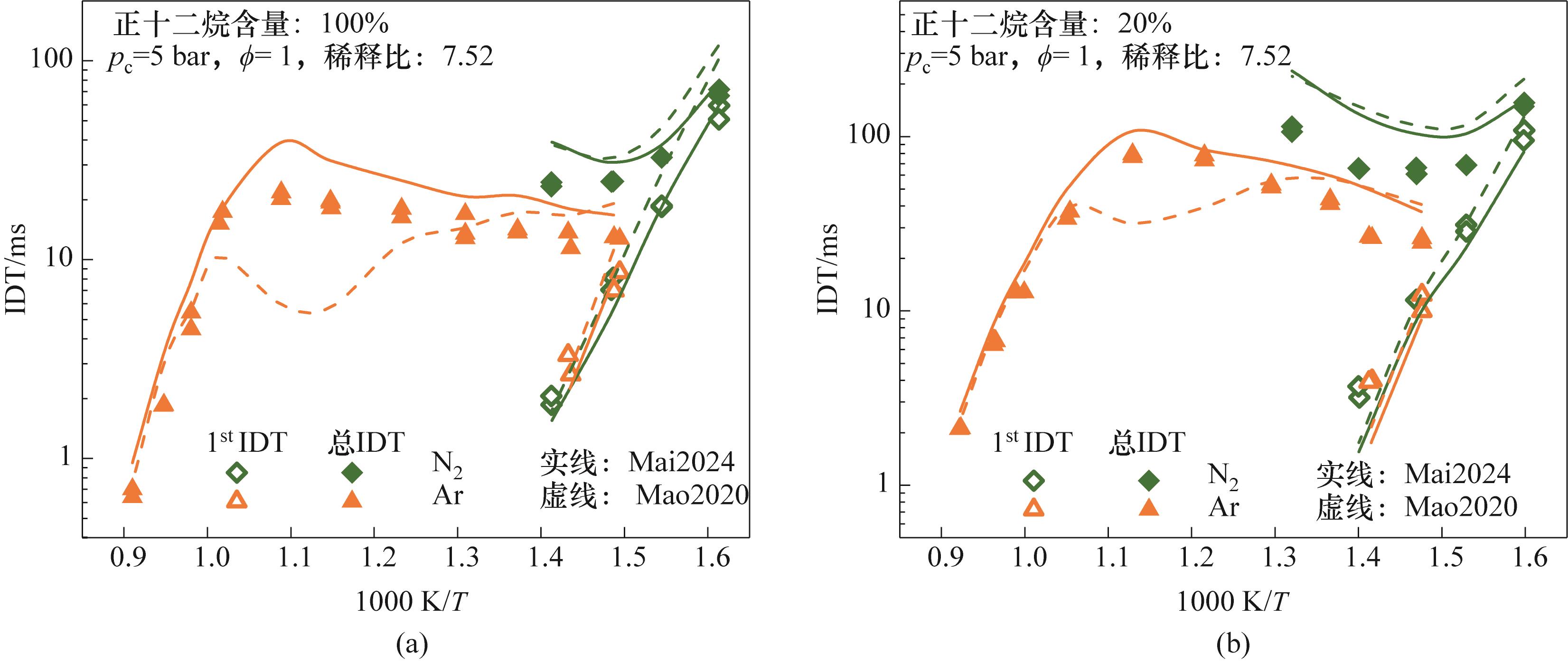 Fig.4 The measured and model-predicted IDTs of n-C12H26/CH4 binary mixtures with 100% and 20% n-C12H26 content under different dilution gas conditions