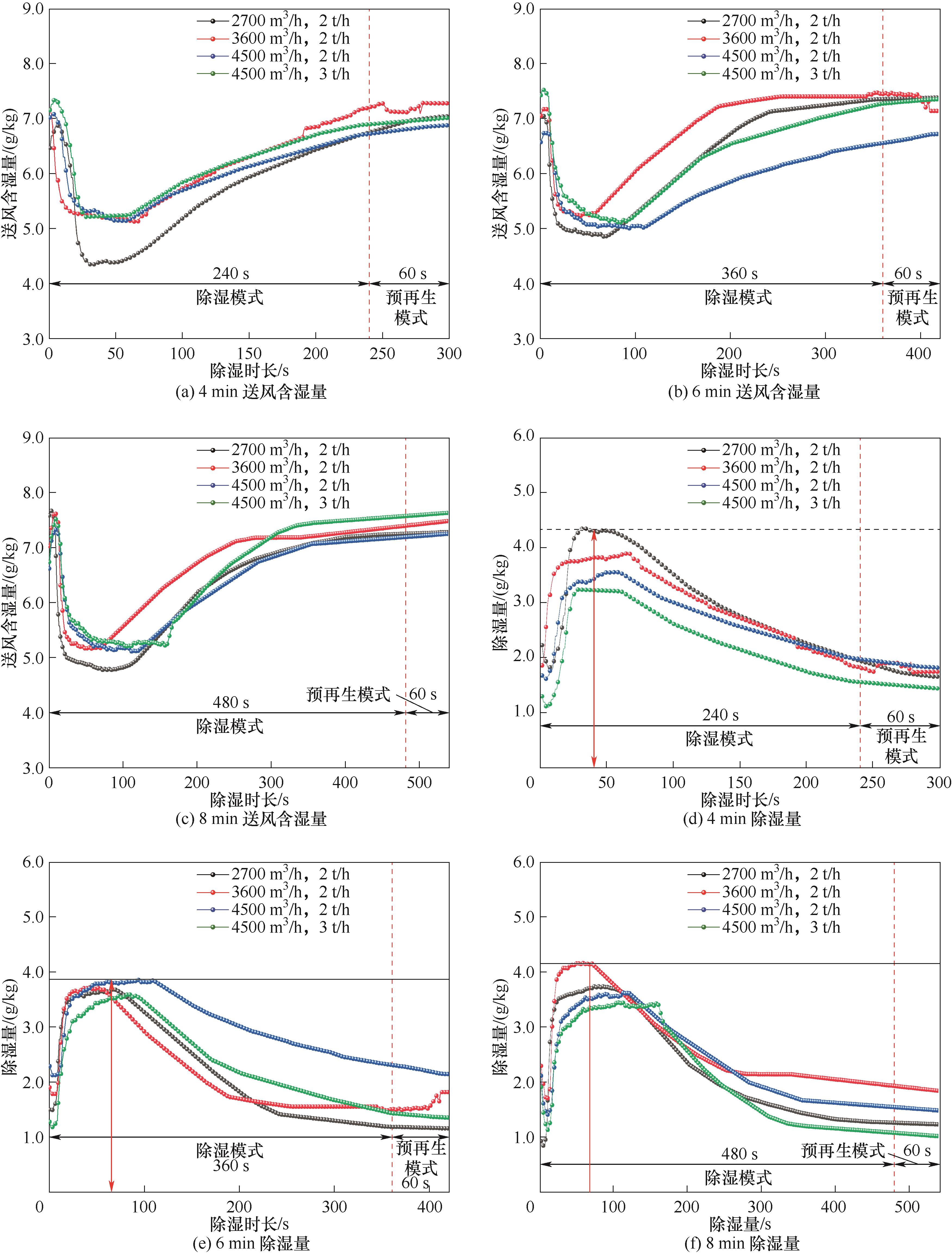 | 工况 | 测试风量/(m3/h) | 除湿时长/s | 预再生时长/s | 热水温度/℃ | 热水流量/(m3/h) | 最大除湿量/(g/kg) | 平均除湿量/(g/kg) |