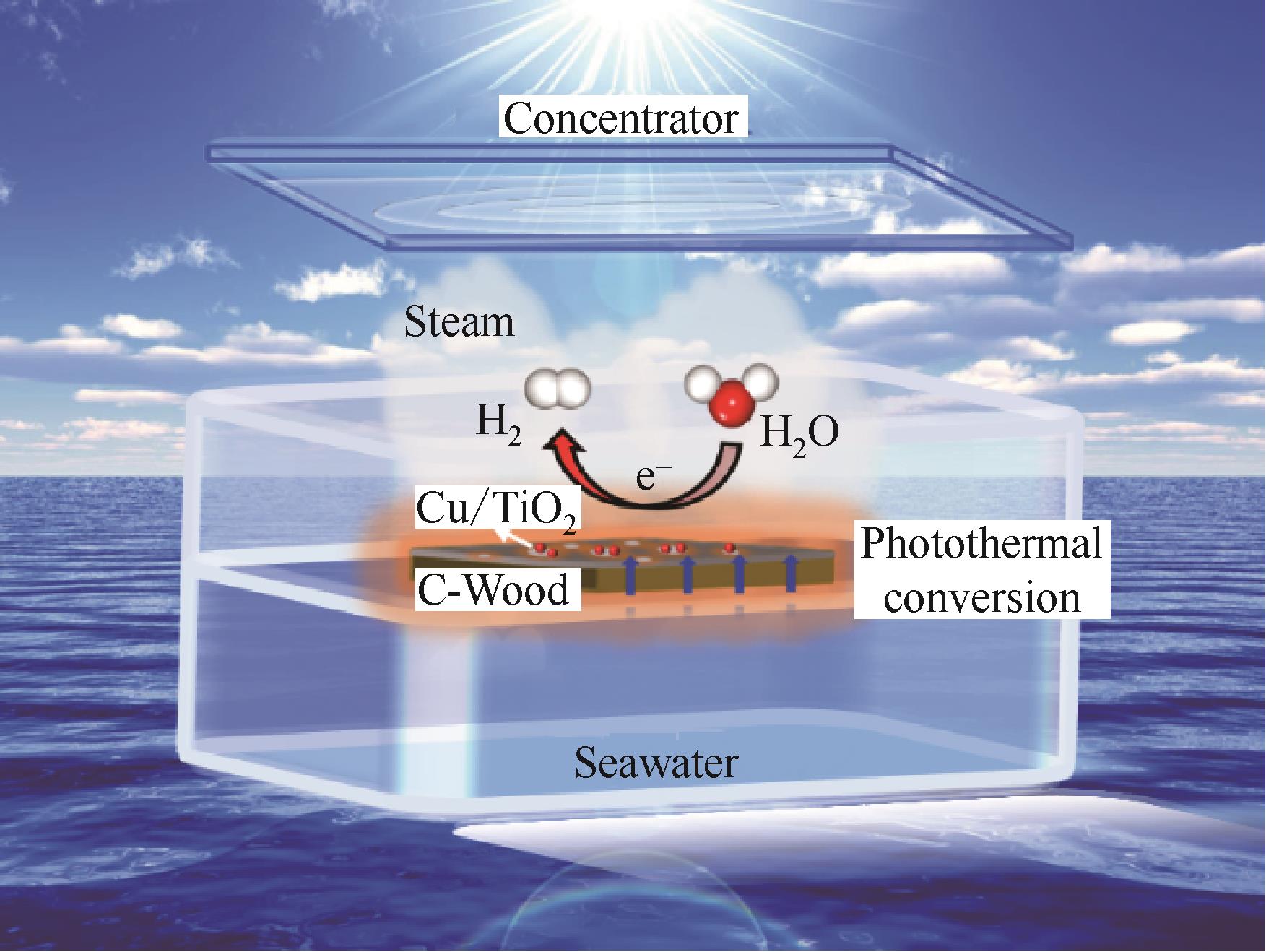 基于Cu/TiO2/C-Wood复合材料的聚光太阳能驱动自漂浮高效海水汽化催化分解制氢体系 |