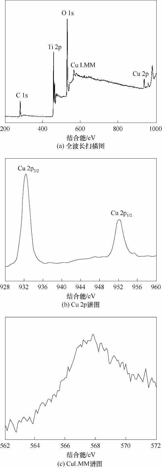 | 图2 Cu/TiO2纳米粒子的XPS谱图全波长扫描图(a);Cu 2p谱图(b);CuLMM谱图(c) |