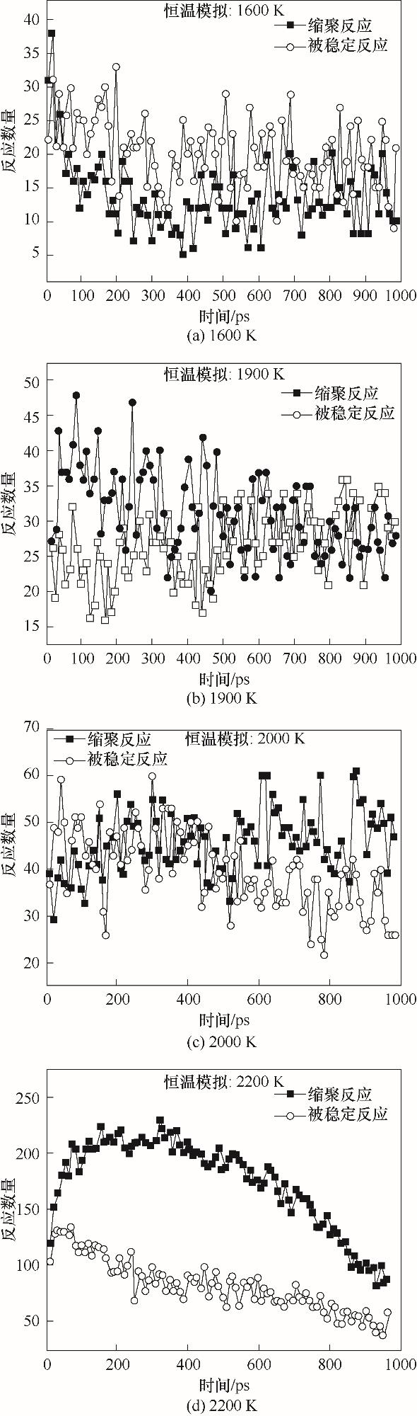 | Fig.2 Number evolving tendencies of condensation reactions and stabilization reactions with volatile radicals involved obtained from long-time iso-thermal ReaxFF MD simulations at different temperatures |
