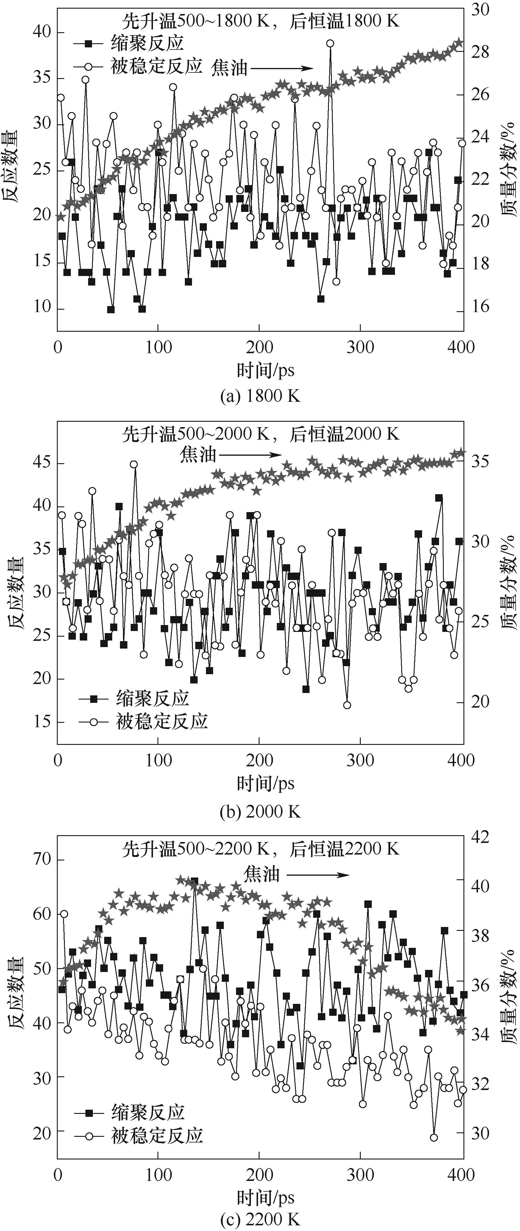 | Fig.4 Number evolving tendencies of condensation reactions and stabilization reactions with volatile radicals involved at late pyrolysis stage obtained from ReaxFF MD simulations at different temperatures |