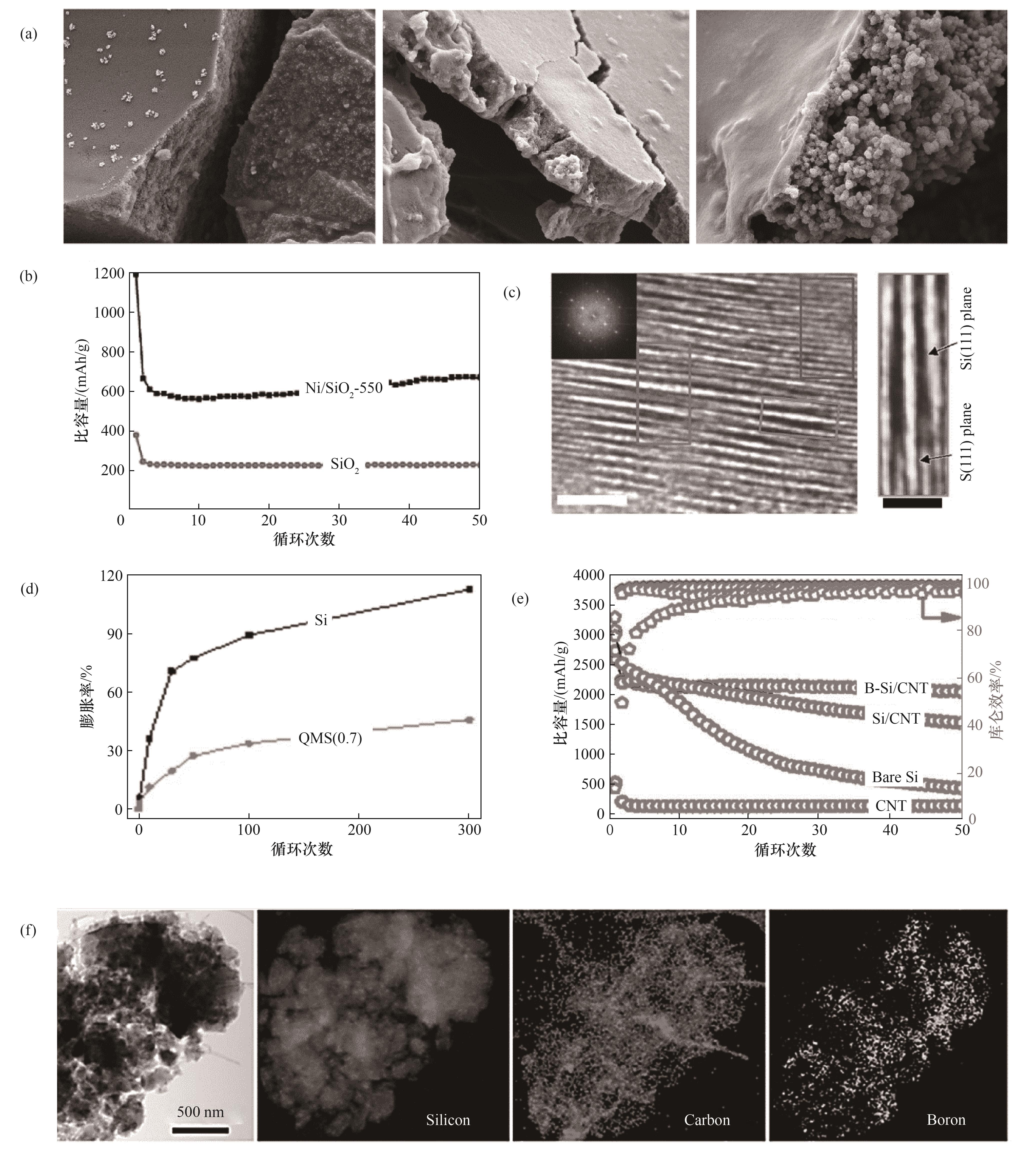 | 图4 (a)不同比例N掺杂循环后电极SEM图;(b)Ni元素掺杂与硅氧负极循环比较;(c)QMS的TEM图像以及放大后晶格条纹TEM图像;(d)QMS与Si电极300次循环后膨胀率对比;(e)不同材料负极长循环对比;(f)B元素均匀掺杂[ |