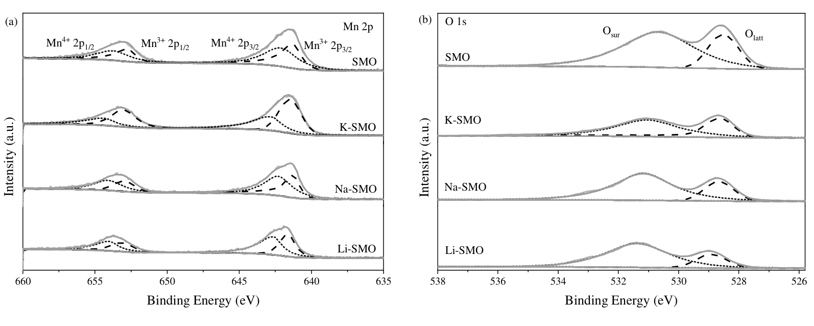 | Fig.5 XPS Mn 2p (a) and O 1s (b) spectra of SrMnO3 supported by different alkali metals |