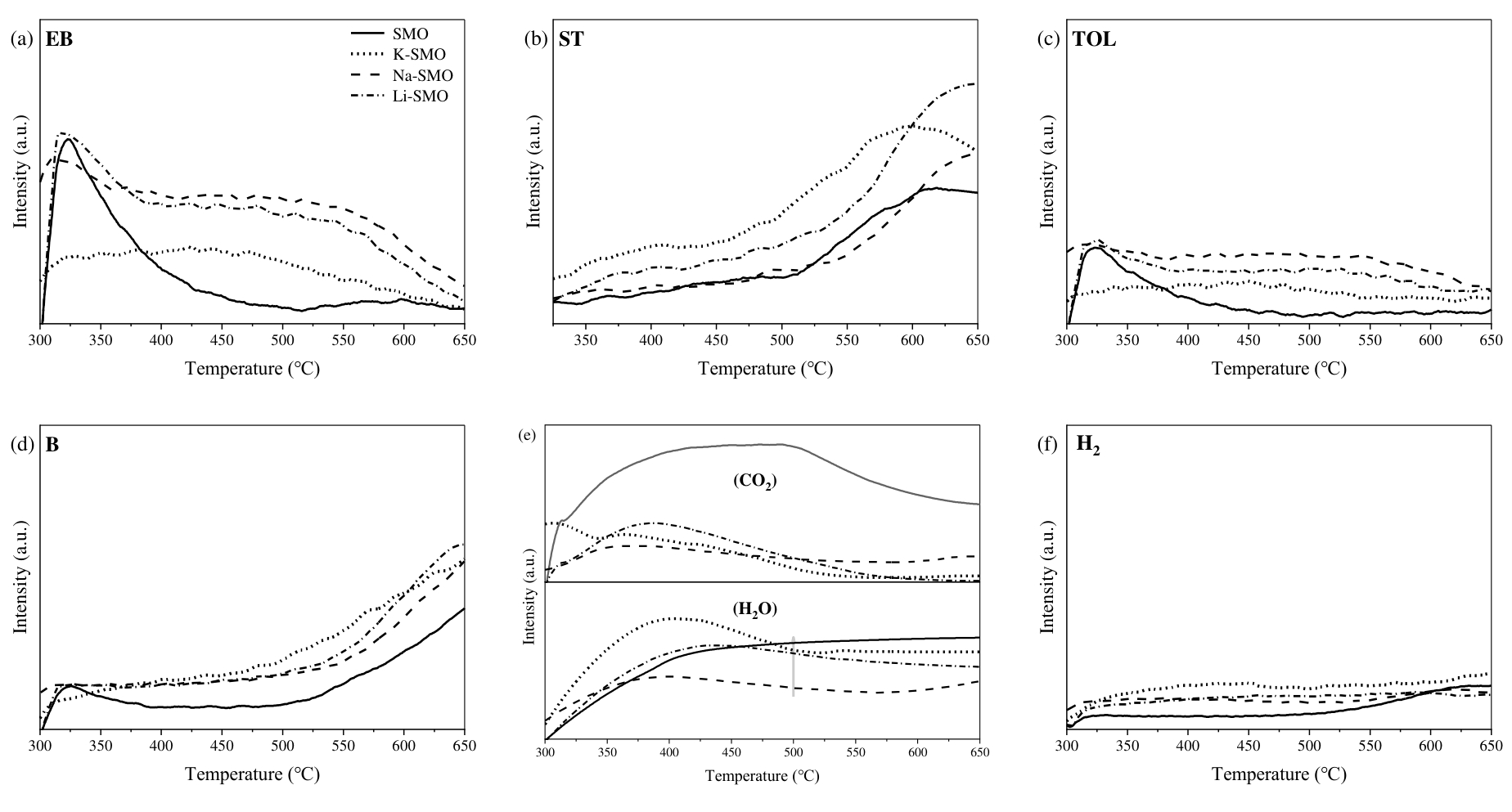 | 图6 不同碱金属负载的SrMnO3样品EB-TPR实验的质谱曲线(a-f)乙苯、苯乙烯、甲苯、苯、水蒸气、二氧化碳和氢气(条件:反应温度 = 300 ~ 650℃,m = 200 mg, FEB/Ar = 25 mL•min-1,EB/Ar混合气氛,持续通入Ar通过30℃乙苯鼓泡器) |
